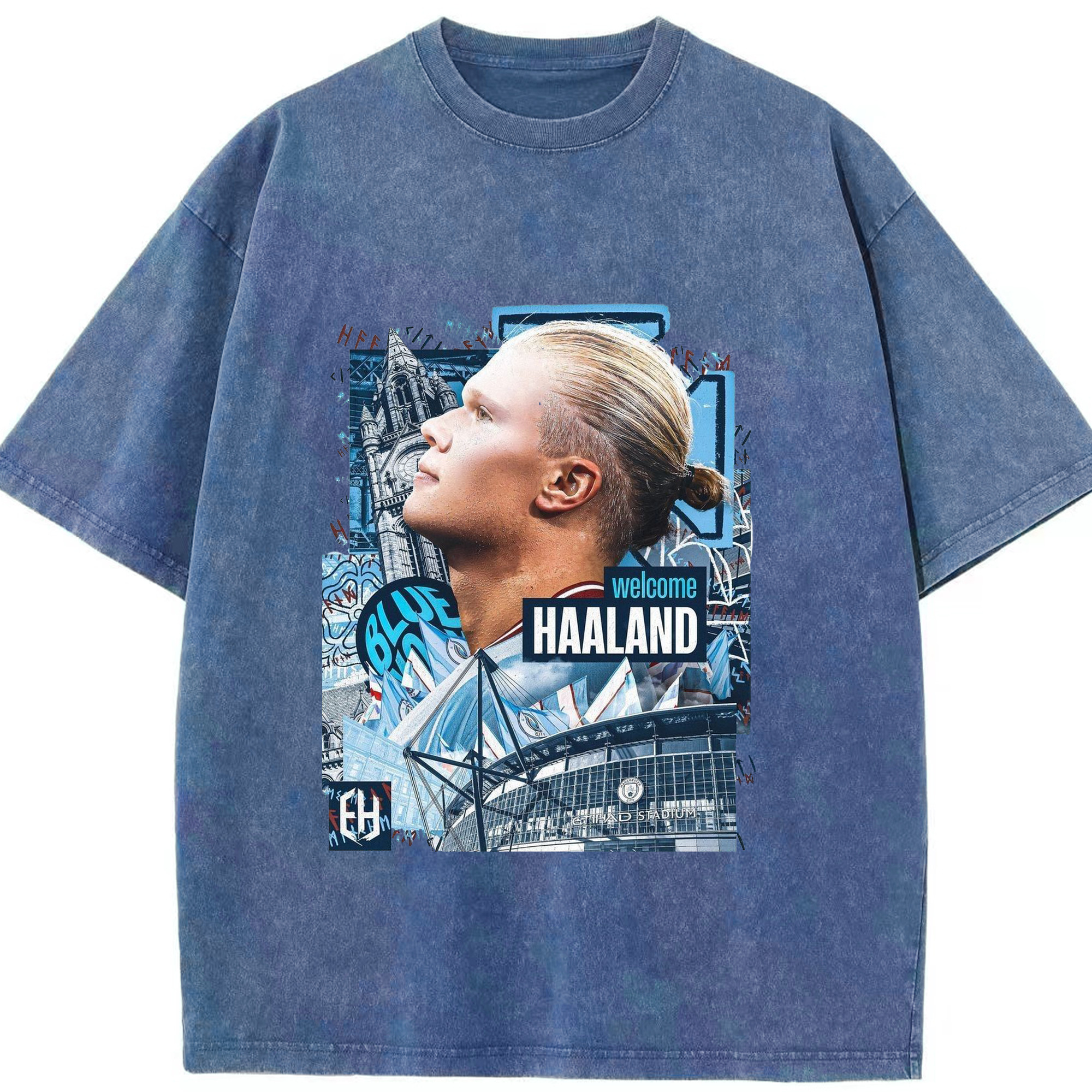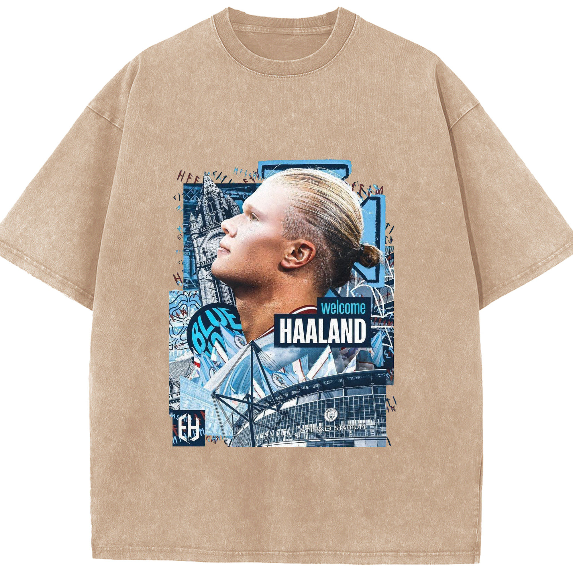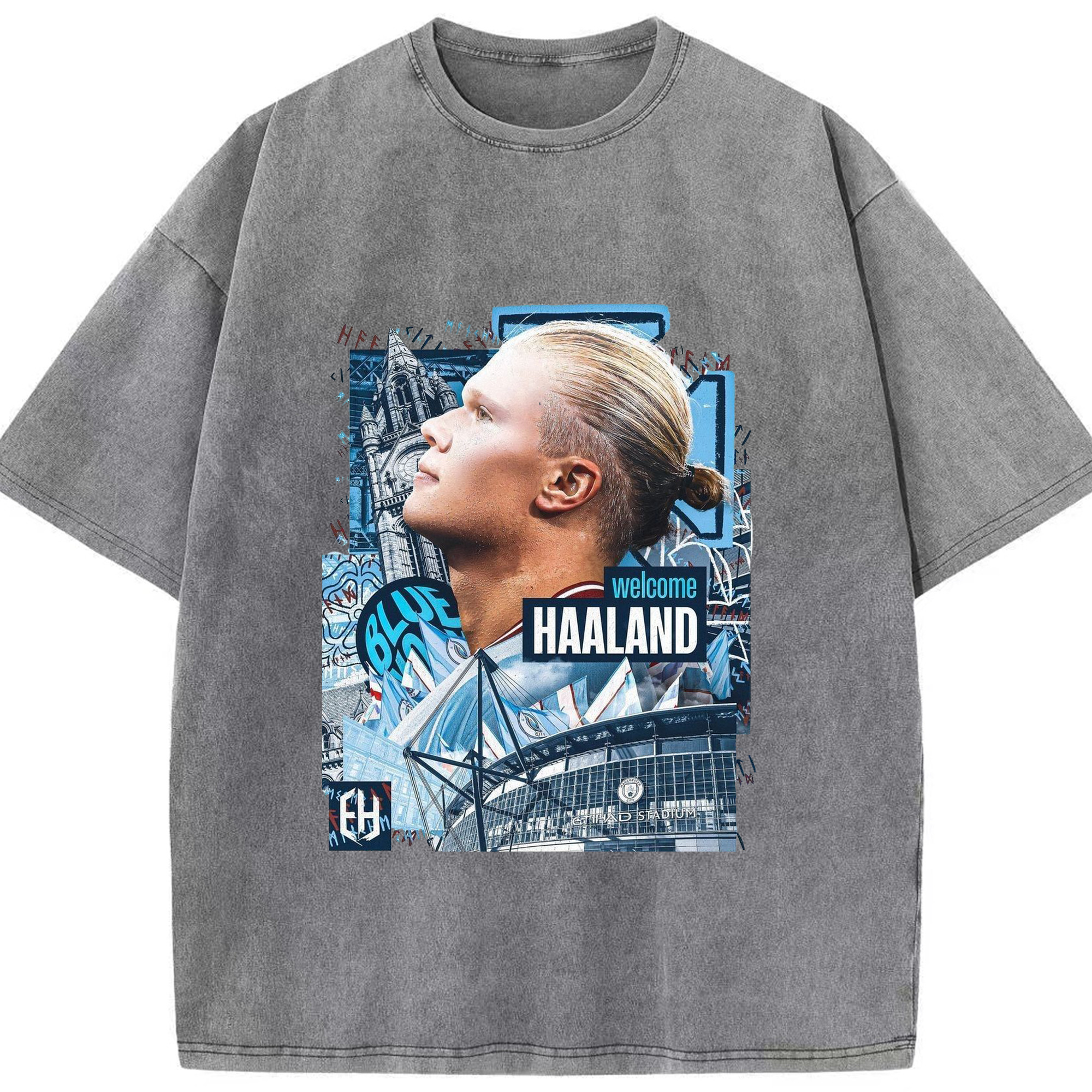 Erling Haaland 世界を震わす一撃 - 綿100% ヴィンテージ風 半袖Tシャツ ・ フロントプリント ・ 柔らか肌触り ・ 通気性 快適 ・ スポーツ カジュアル 外出用