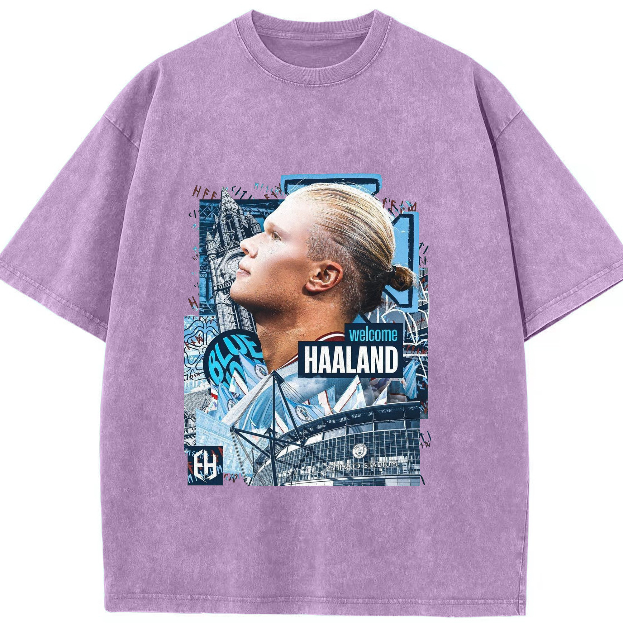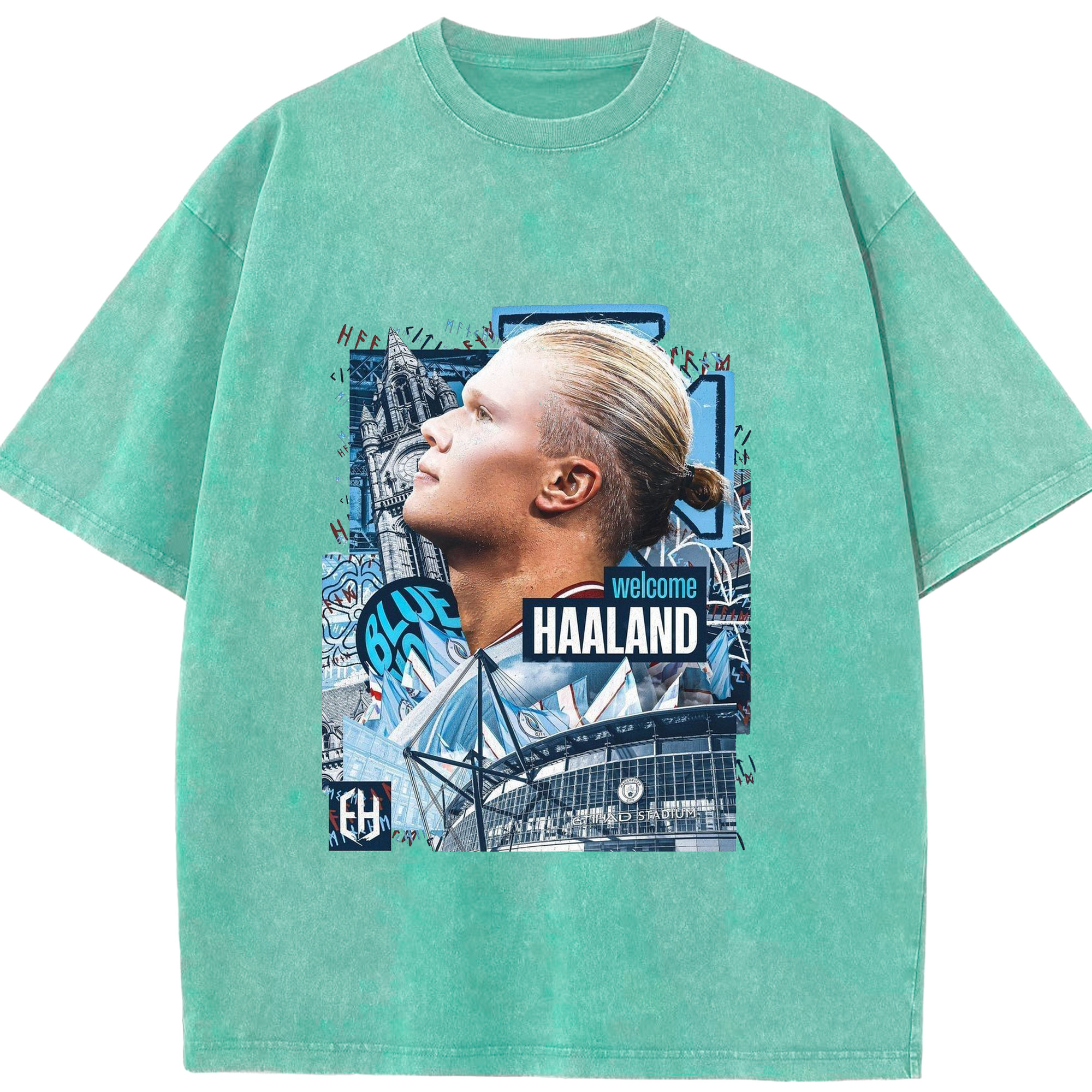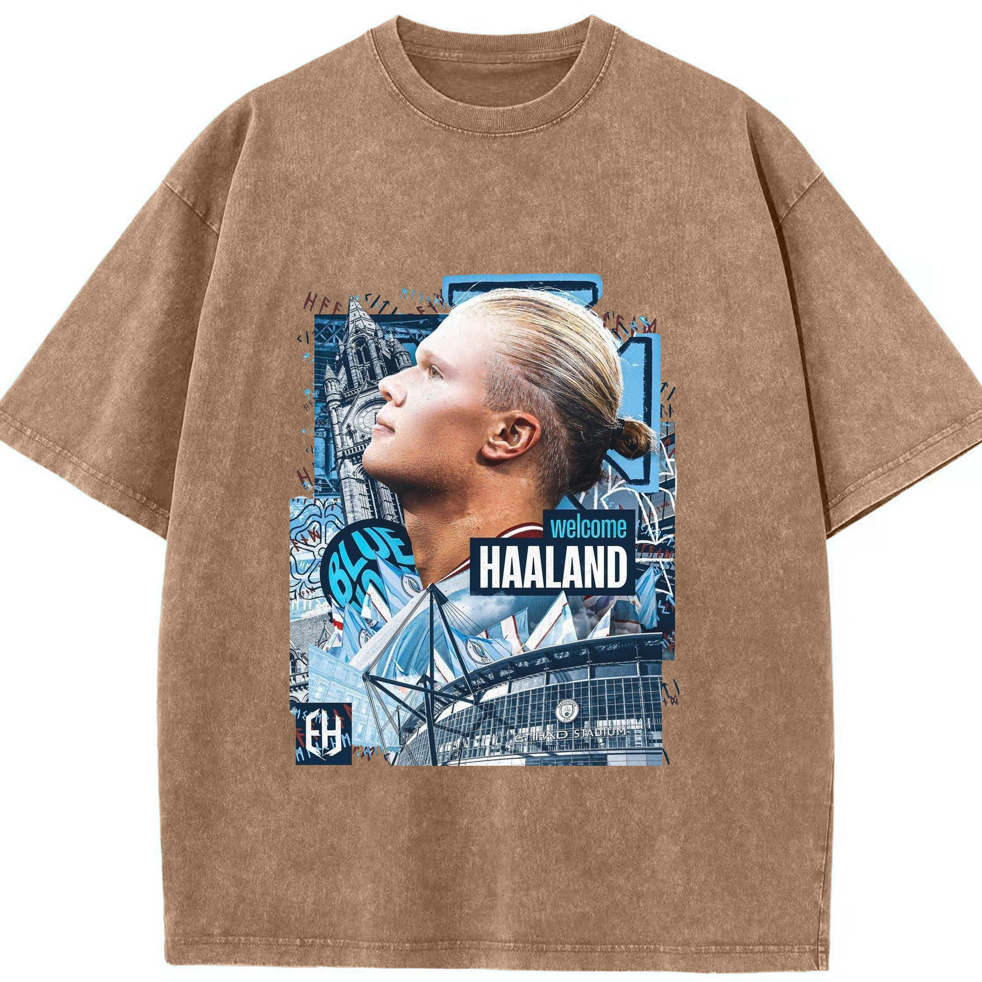 Erling Haaland 世界を震わす一撃 - 綿100% ヴィンテージ風 半袖Tシャツ ・ フロントプリント ・ 柔らか肌触り ・ 通気性 快適 ・ スポーツ カジュアル 外出用