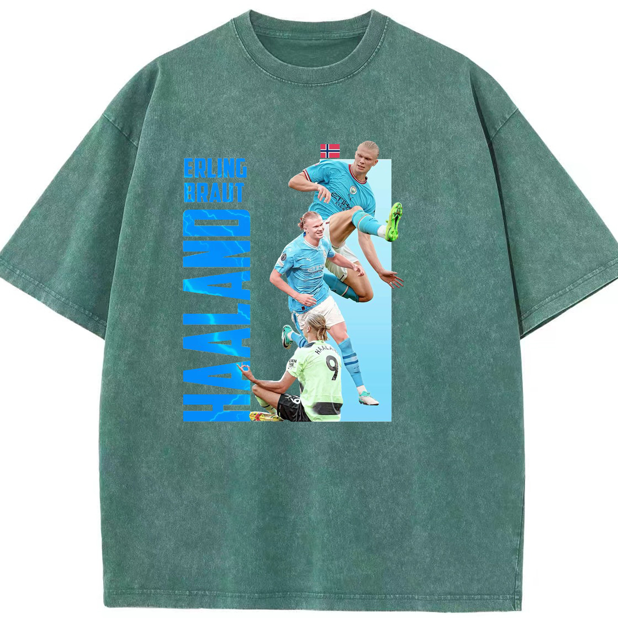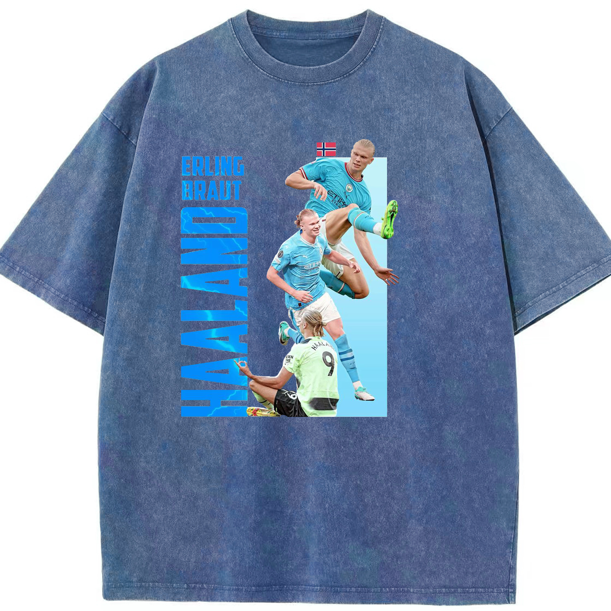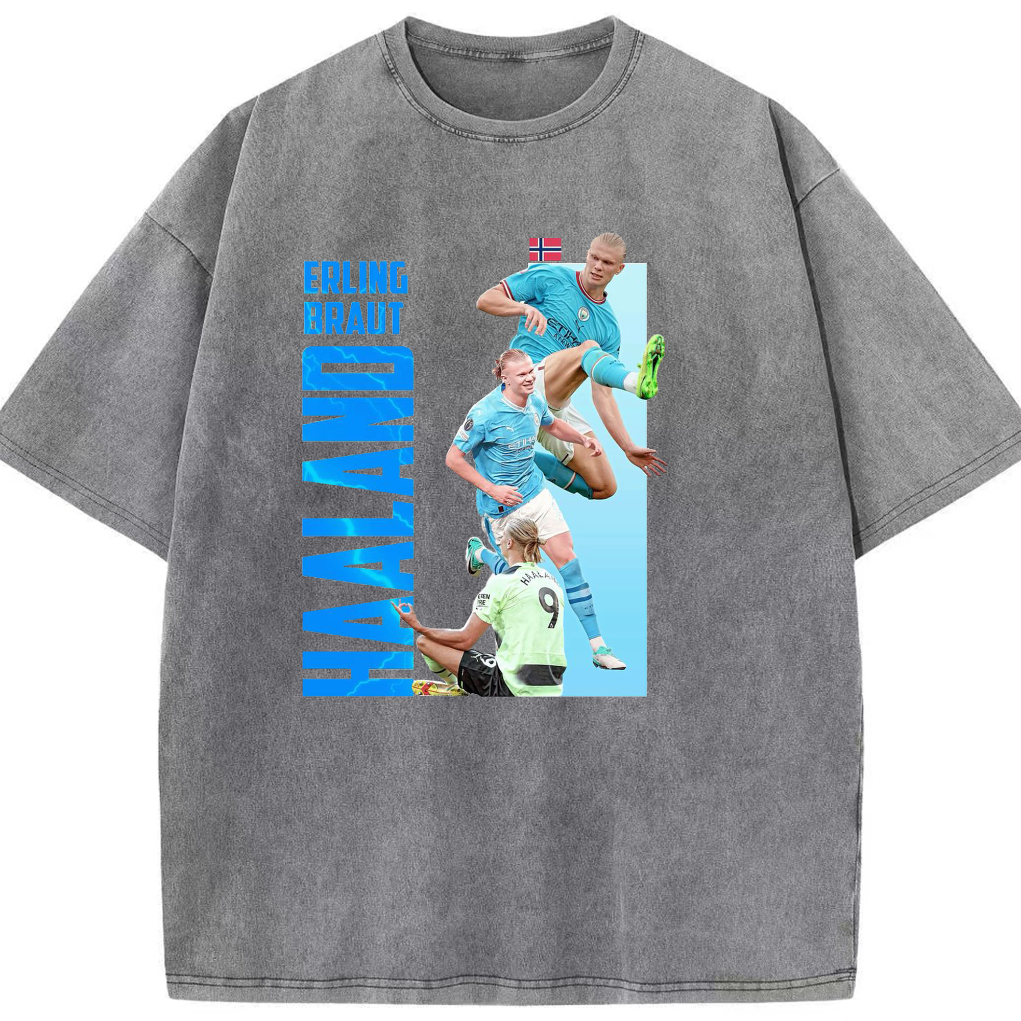 Erling Haaland 世界を震わす一撃 - 綿100% ヴィンテージ風 半袖Tシャツ ・ フロントプリント ・ 柔らか肌触り ・ 通気性 快適 ・ スポーツ カジュアル 外出用