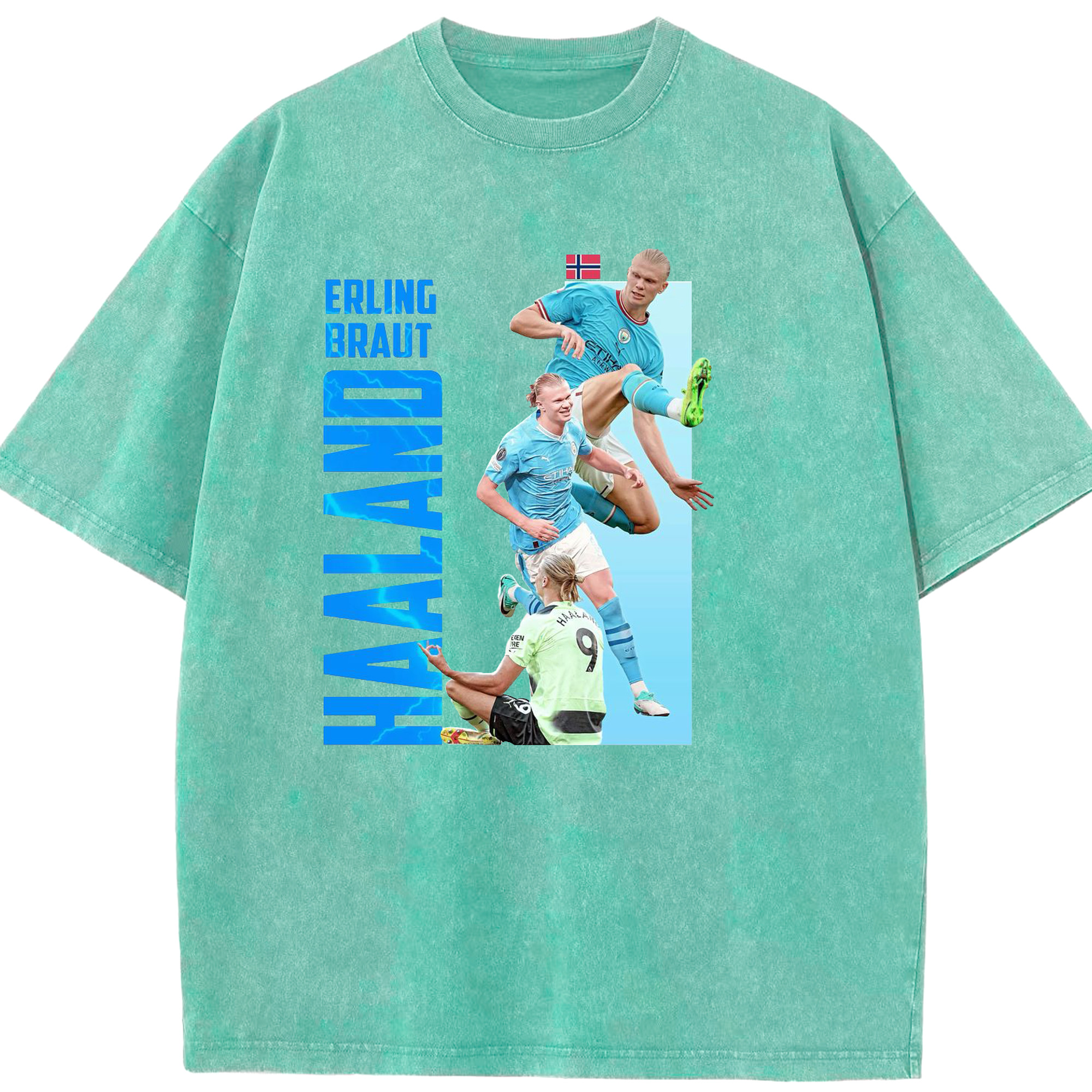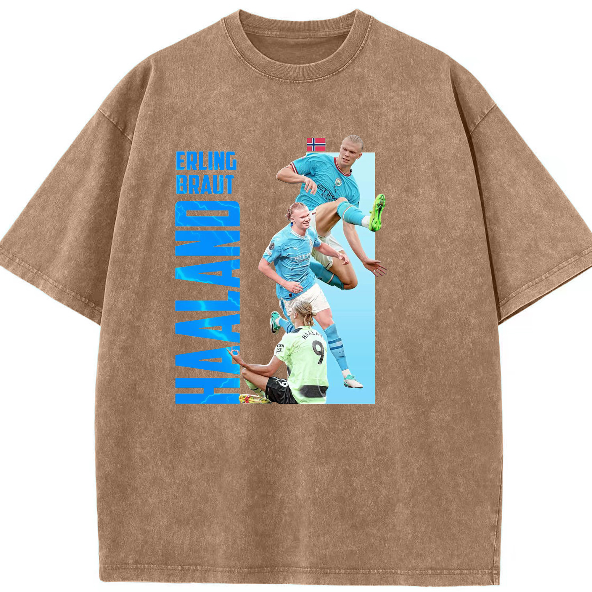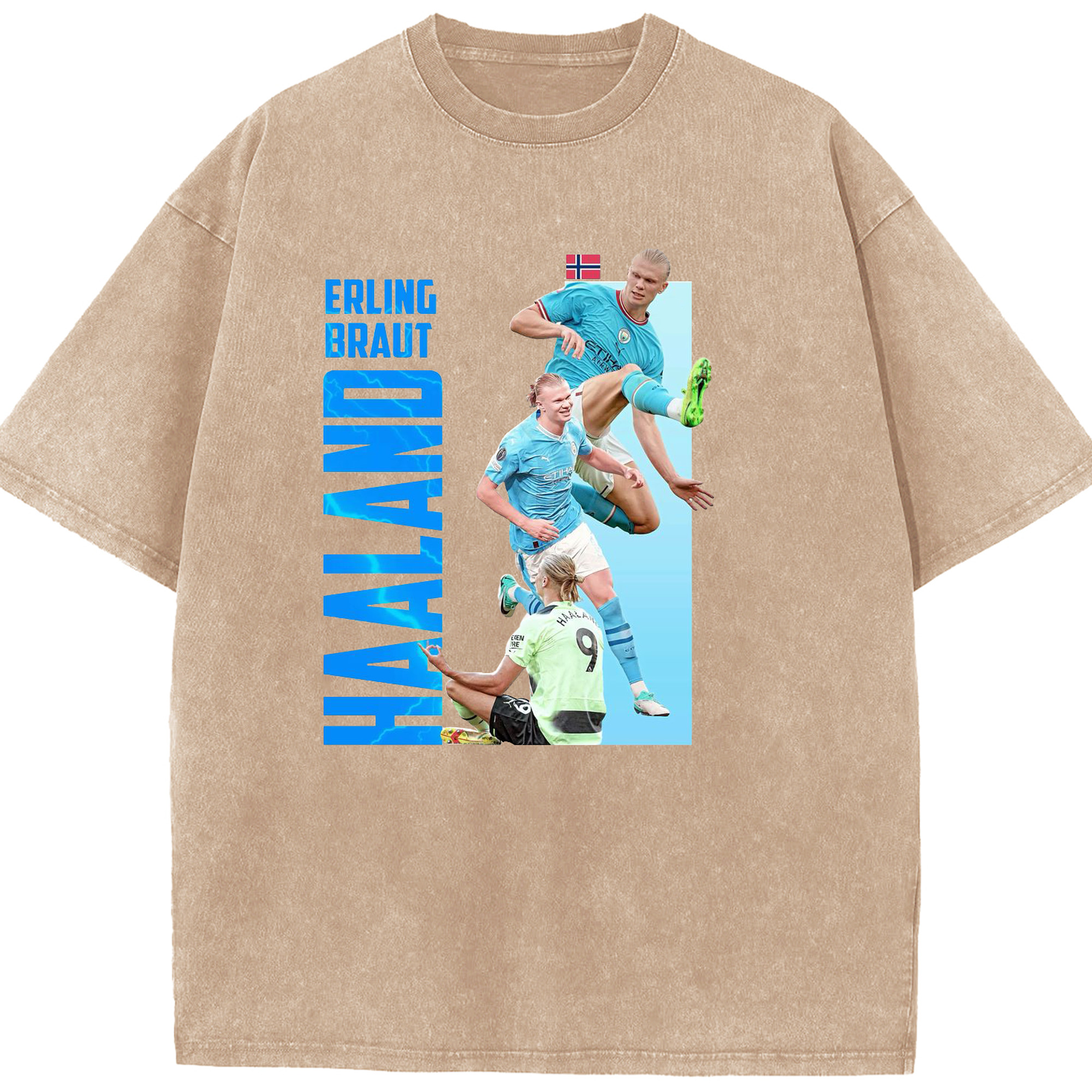 Erling Haaland 世界を震わす一撃 - 綿100% ヴィンテージ風 半袖Tシャツ ・ フロントプリント ・ 柔らか肌触り ・ 通気性 快適 ・ スポーツ カジュアル 外出用